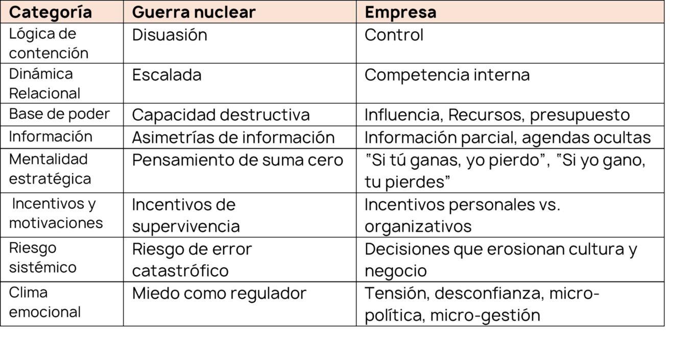 Como en la guerra nuclear, el peligro ya no es el enemigo: Es el error de la reacción emocional bajo estrés, de la falta de reconocimiento entre personas y equipos, de la ausencia de cuidado mutuo, del bloqueo de posibilidades dentro del sistema.